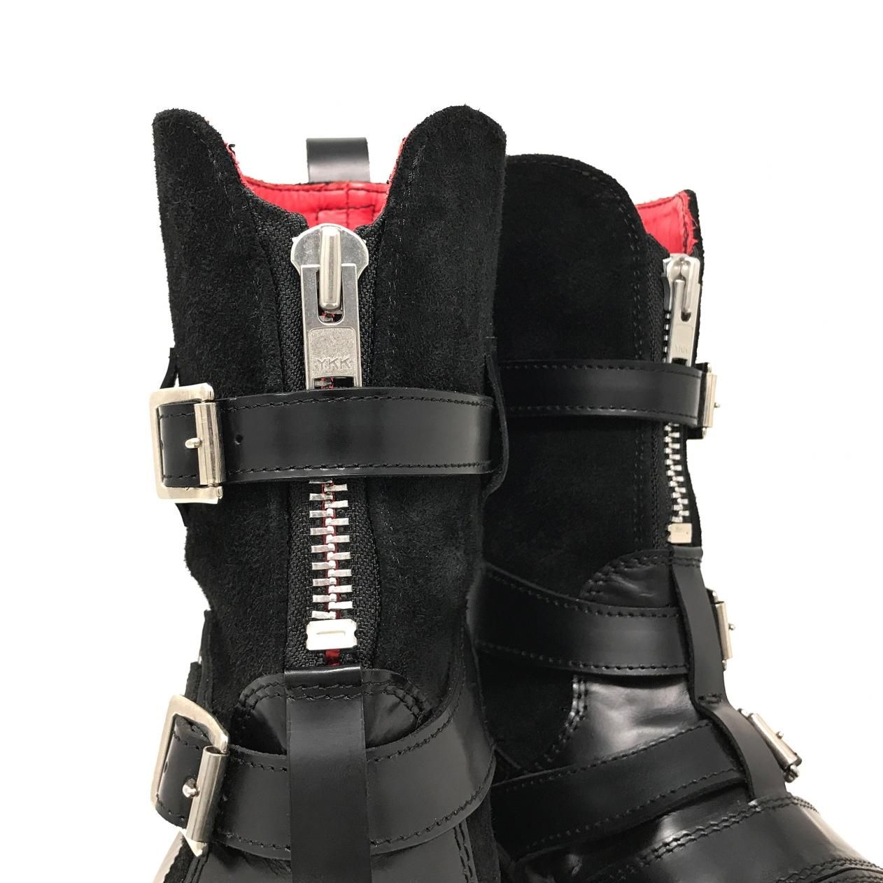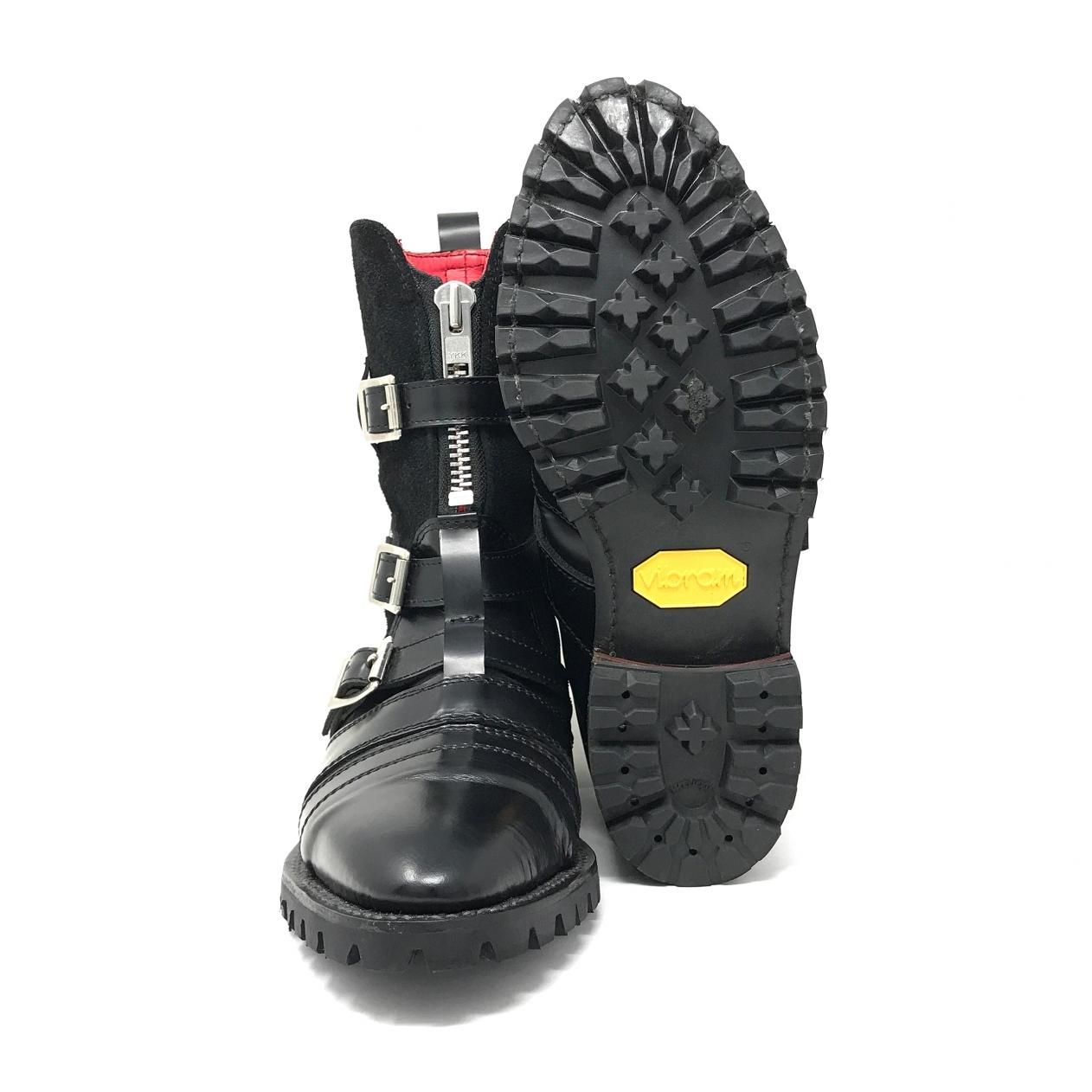 屈強たる現代仕様の剛性は、ソリッドであり続けるハードコア。全パーツ素材、 形状の見直しと再編成により、現代的なデザインとして生まれ変わる。屈強たる皮革の選択は国産最上質皮革。本体強度を堅牢にすべく伝統的な製法で、一足ずつハンドメイドにより強靱なブーツとして生まれ変わる。ソールはビブラム100番/コマンドソール。オリジナルのレザーソールが醸し出す完成された表情は理解はしているが、強度 / 耐性に難があり、雨、雪、長期使用には決定的な弱点がある事は、所有した誰もが経験した事実であろう。その忌々しい問題点に着眼 し、機能面での改善として辿り着いたのがこのソールだ。個体として、また履いた時のルックスを踏まえて、ソールとアッパーのバランスや本体強化を同時に図りながら、ハイポテンシャルな精度に引き上げる。今までのゼロブーツとは決定的に違うことが履く事によって理解することが出来るであろう。スウェード部分も同様に激選された上質皮革。下処理を施してある為、滑らかかつ堅牢な質感。 従来のスウェードに比べ耐久力を念頭に選ばれている為長期使用が可能。デザインは上記で示されたMellanddi Taste From Carnaby Street London 82。極太ジップが次世代にシフトする。筒の部分は太すぎず細すぎずをテーマに計算され たサイズ感。インアウトどちらでも行けるよう設計されている。特筆すべきは、 脱ぎ履きに面倒だった、バックルを外してジップを下まで下げる動作も、エンジニアブーツを履くような感覚で使用できるよう、ルックスを損なう事なく調整を行った点である。